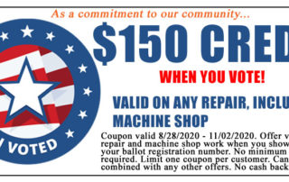 Get Out and Vote – Get $150 Credit from Wise Auto Tech You read that right! As a commitment to our community we are encouraging everyone to vote this year, and to do that we are giving each customer a credit of $150 towards any repair and machine shop work! See the coupon for more details